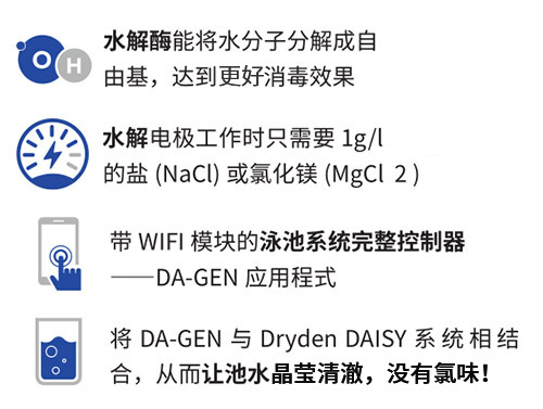 DA-GEN是一種為您泳池服務(wù)的,創(chuàng)新的泳池消毒解決方案。它利用氧化技術(shù)產(chǎn)生自由基(OH·和O·),自由基是高性能氧化劑,其優(yōu)點是不會產(chǎn)生任何有害的消毒副產(chǎn)物。與我們的DrydenDAISY®系統(tǒng)配套使用,讓池水晶瑩清澈,沒有氯味!